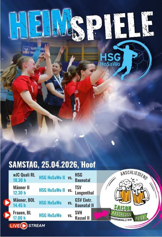 Hoof – Zum Abschluss der Saison 2025/26 steht bei der HSG HoSaWo noch einmal ein echter Handball-Marathon an. Am Samstag, den 25. April 2026, verwandelt sich die Sporthalle in Hoof in eine Bühne für vier spannende Begegnungen – von der Jugend bis zu den Senioren. Spieler, Trainer und Fans wollen gemeinsam einen gelungenen Schlusspunkt unter die Saison setzen.